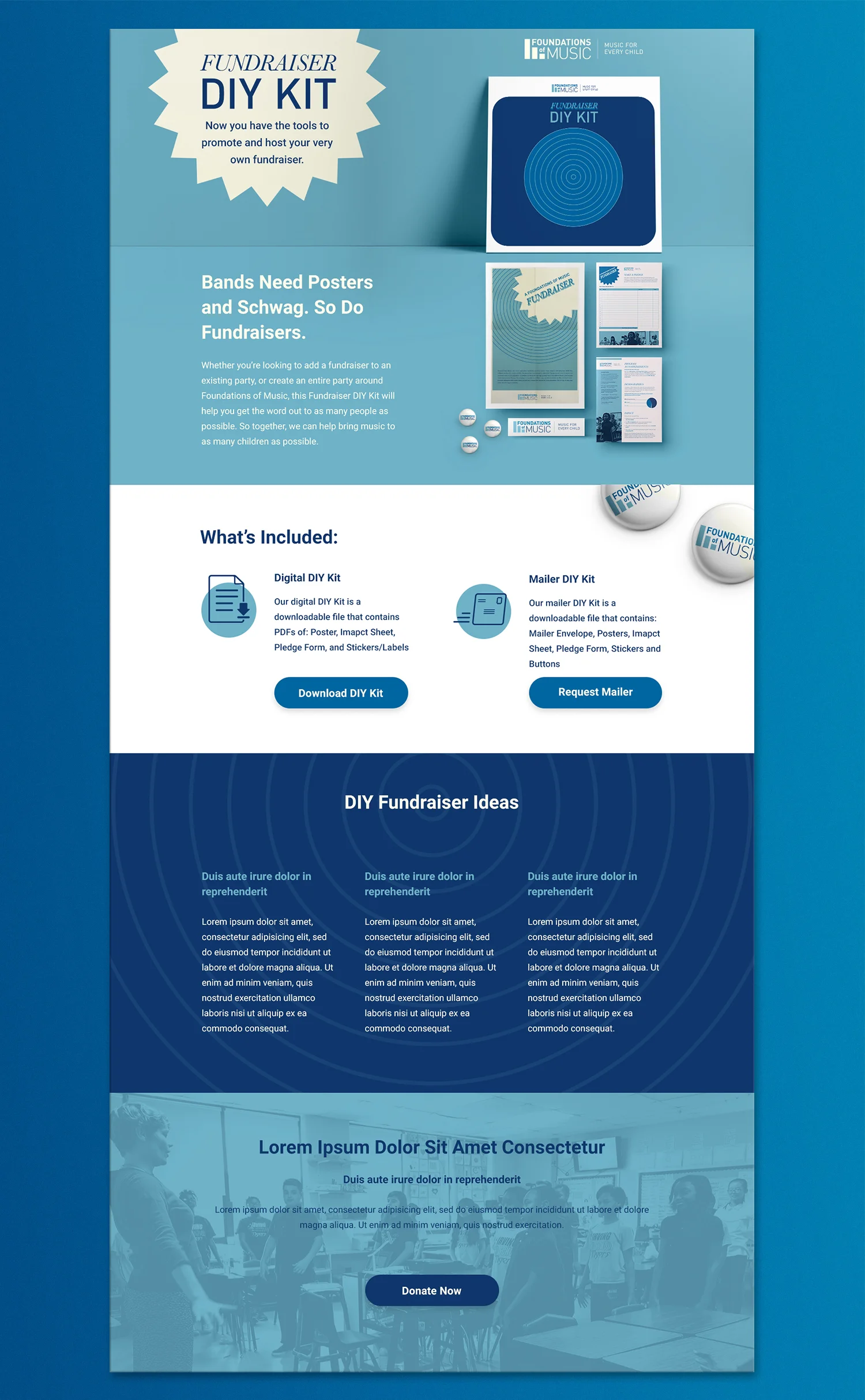 The DIY fundraiser kit was a marketing concept for Giving Tuesday. Anyone interested in hosting their own fundraiser for Foundations of Music could do so with the aid of this kit.