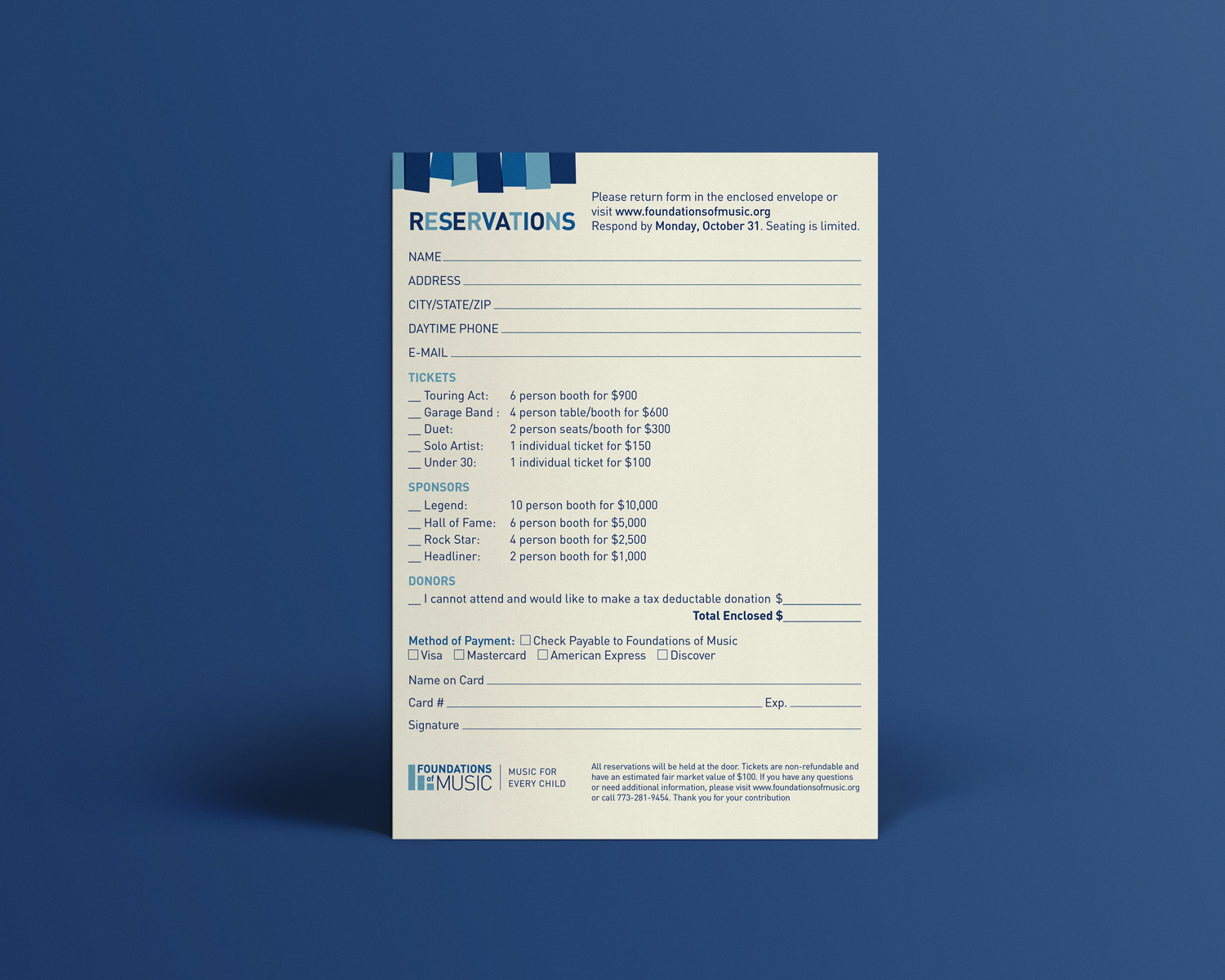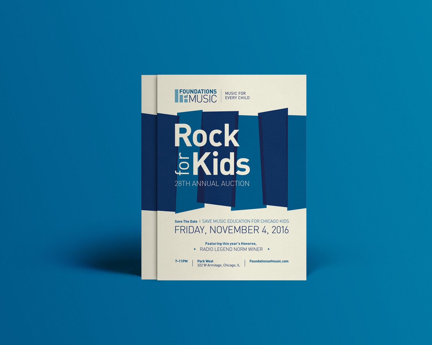 Designed the invitation for the annual Rock For Kids fundraising auction hosted by Foundations of Music. The project included development of a new logo as well as print collateral for the annual auction.