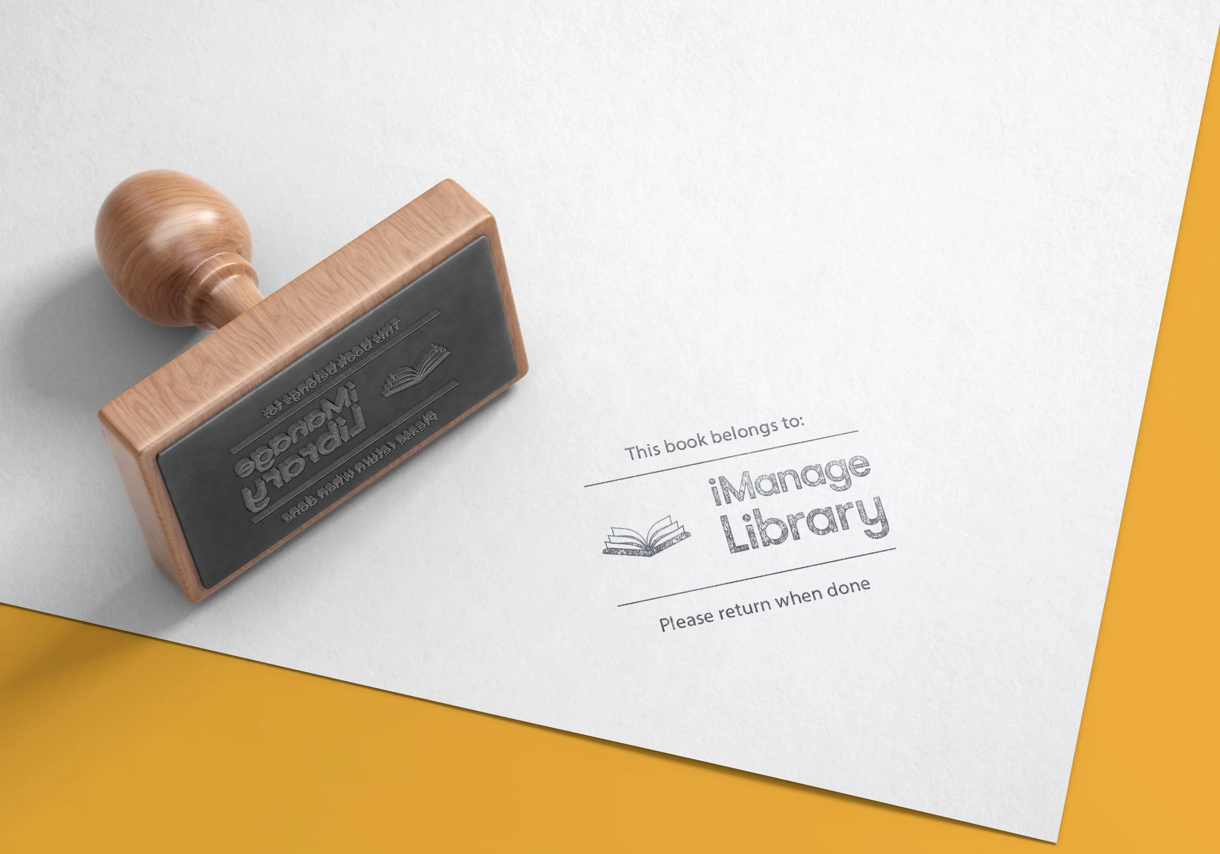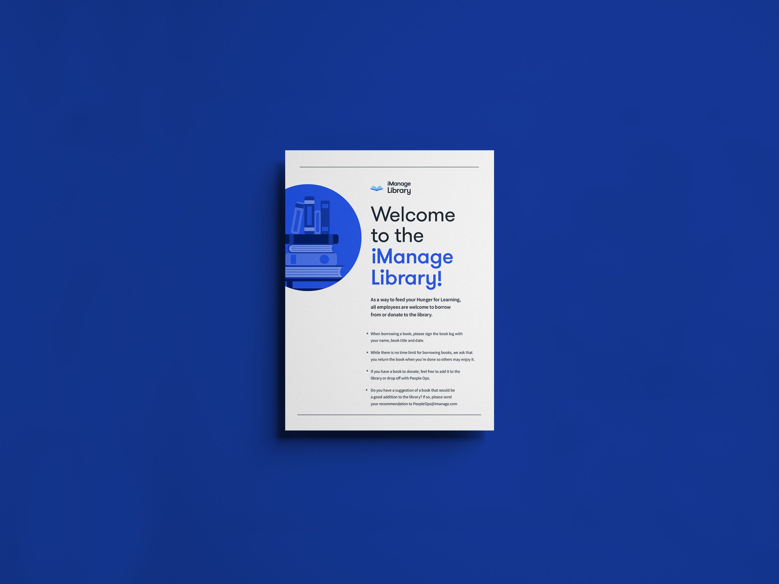 Designed a logo and supporting materials for the iManage office library, including tabletop signage outlining library rules and a stamp lockup used to mark books as part of the collection.