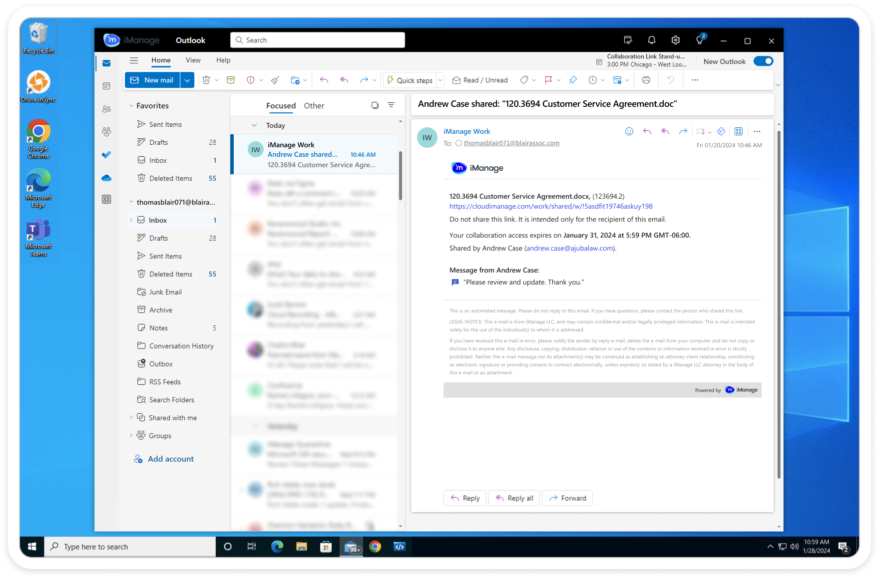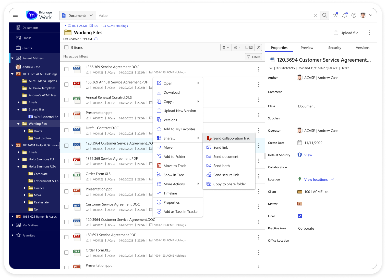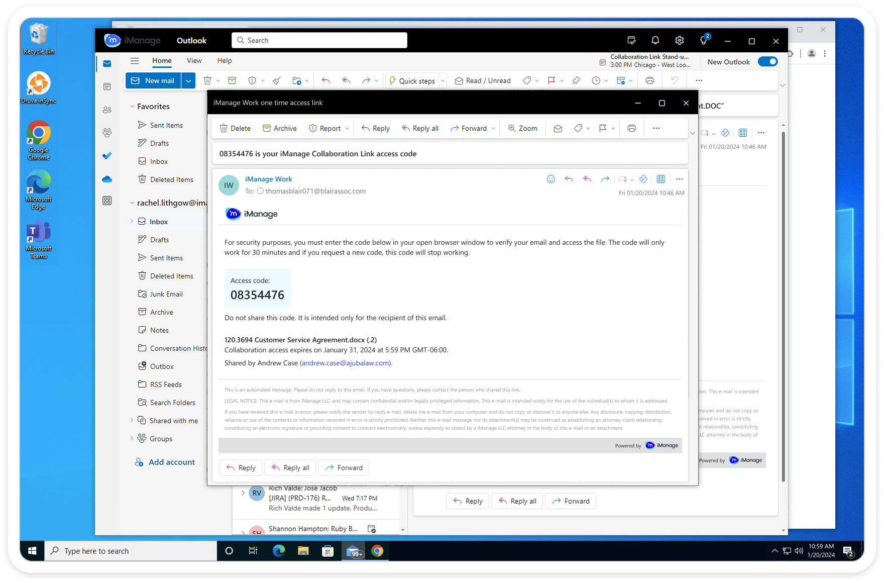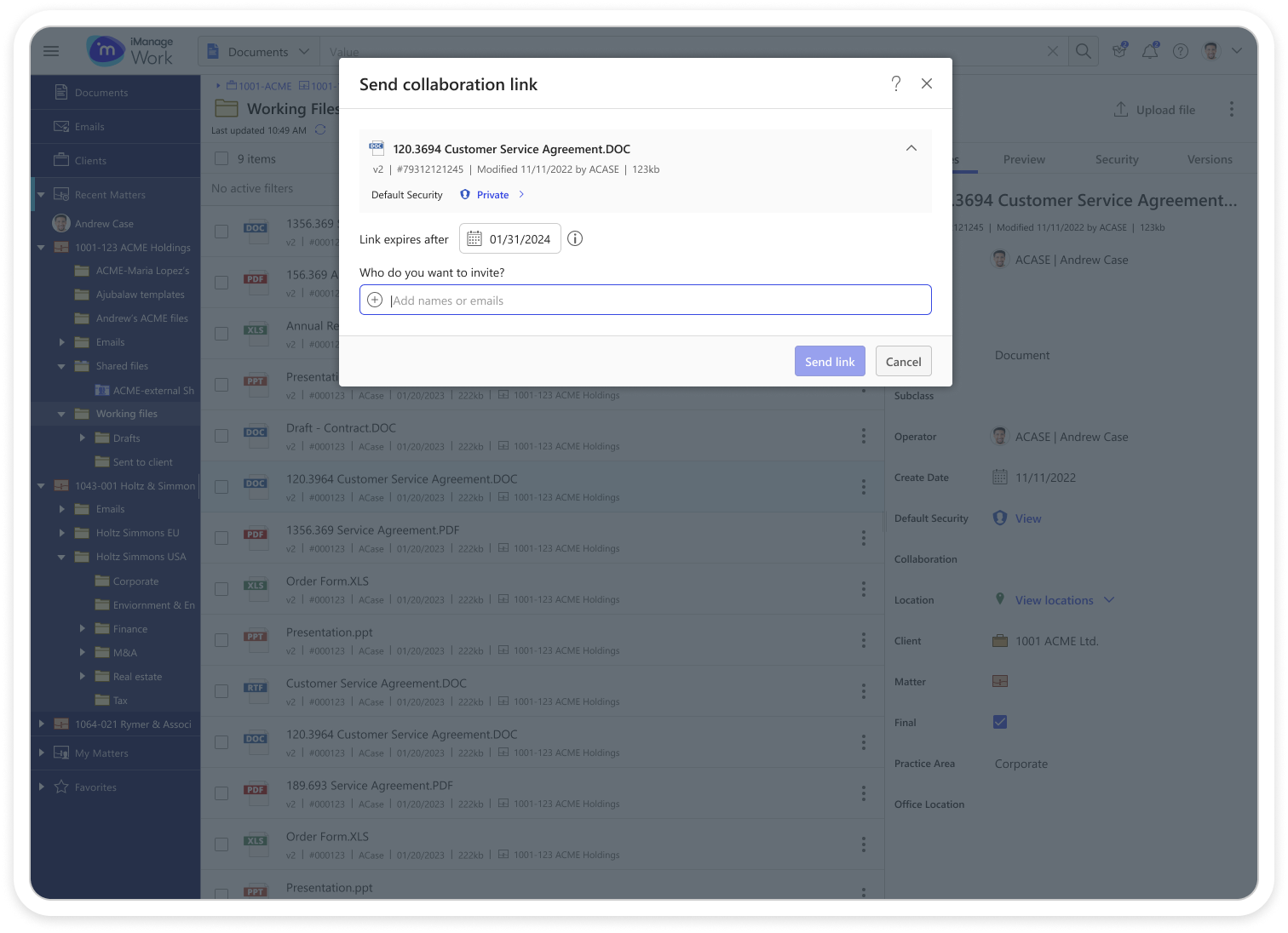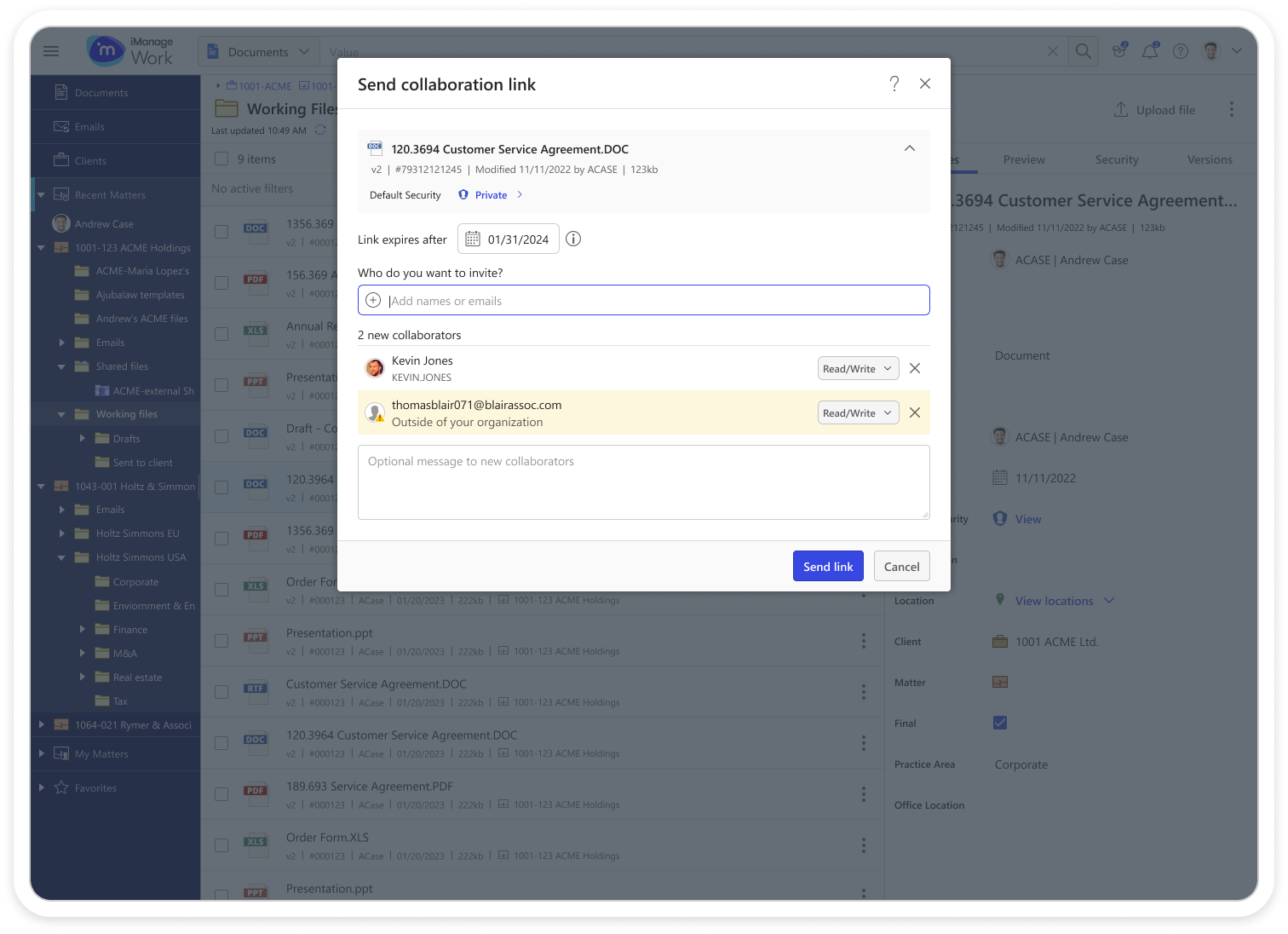 Users could only share documents securely with colleagues who also had iManage Work credentials. This caused frustration and risky workarounds — people often sent files as email attachments, essentially moving documents outside of the platform, which bypassed security and eliminated document activity tracking.