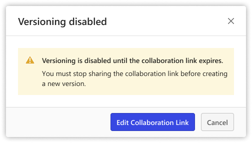 Old design iteration that informed users they could not “version up” a document that was shared with a collaboration link.