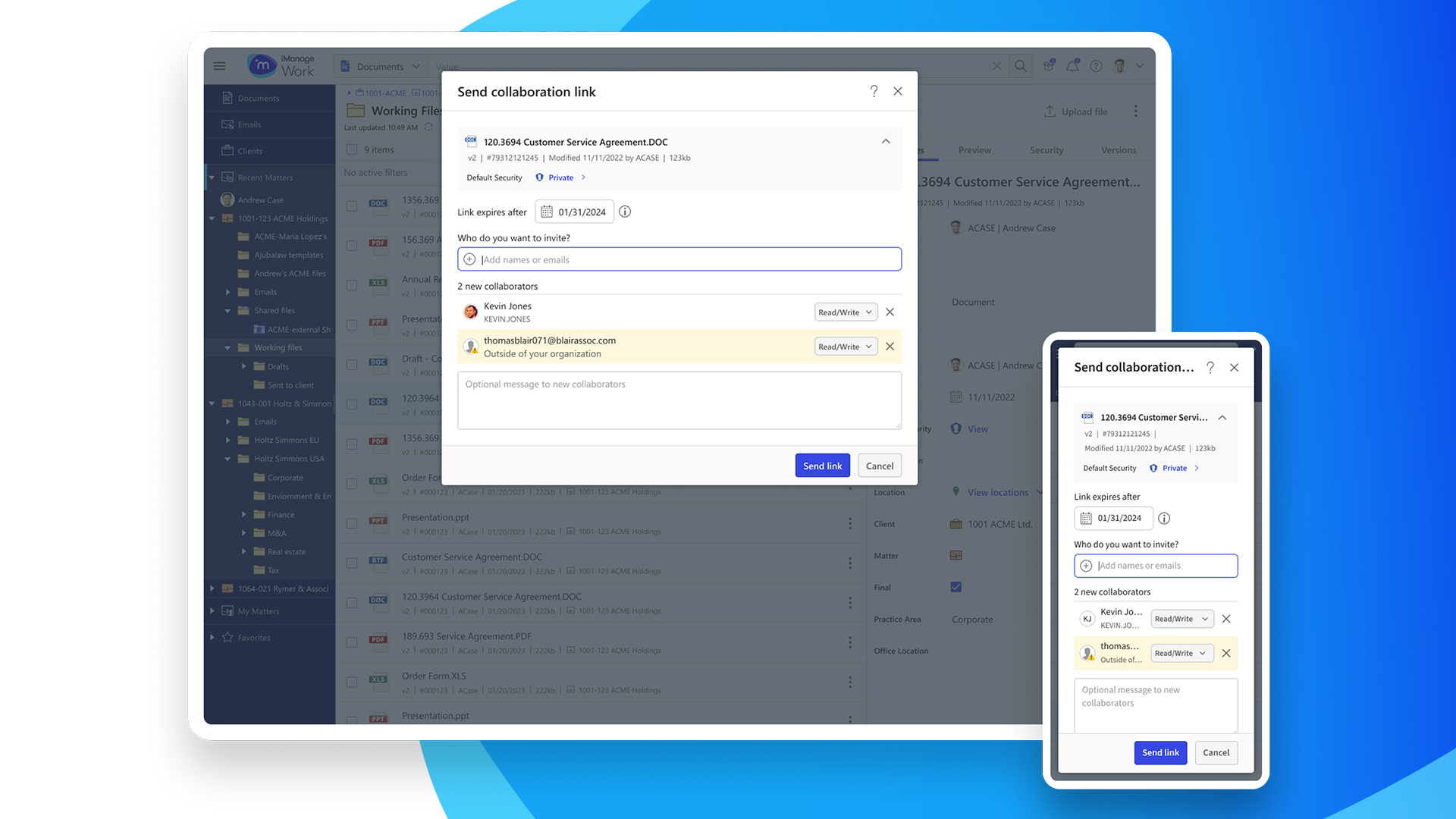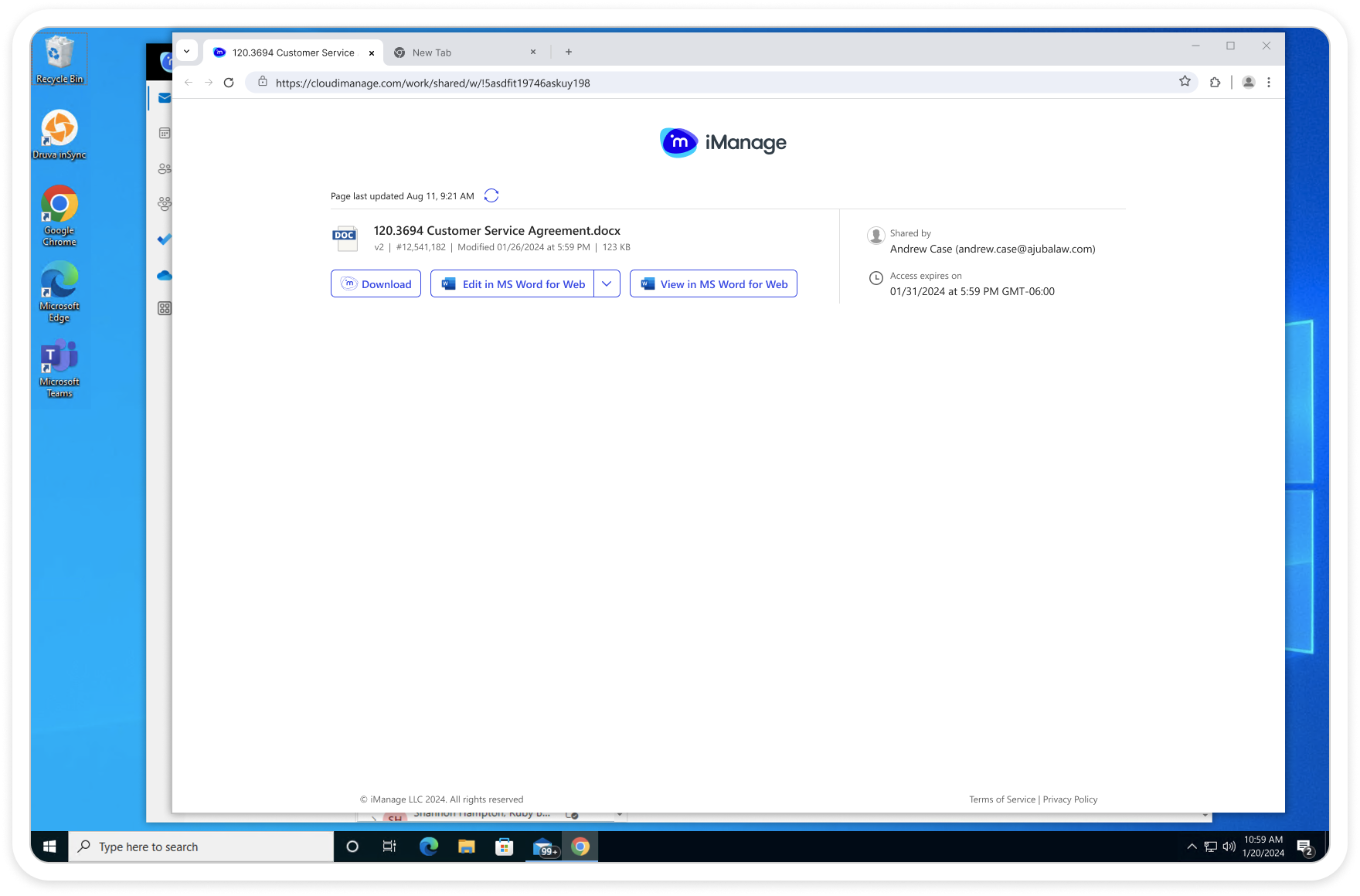 External recipients received a link to a branded iManage landing page, where they could open and collaborate in Microsoft Word in real time.