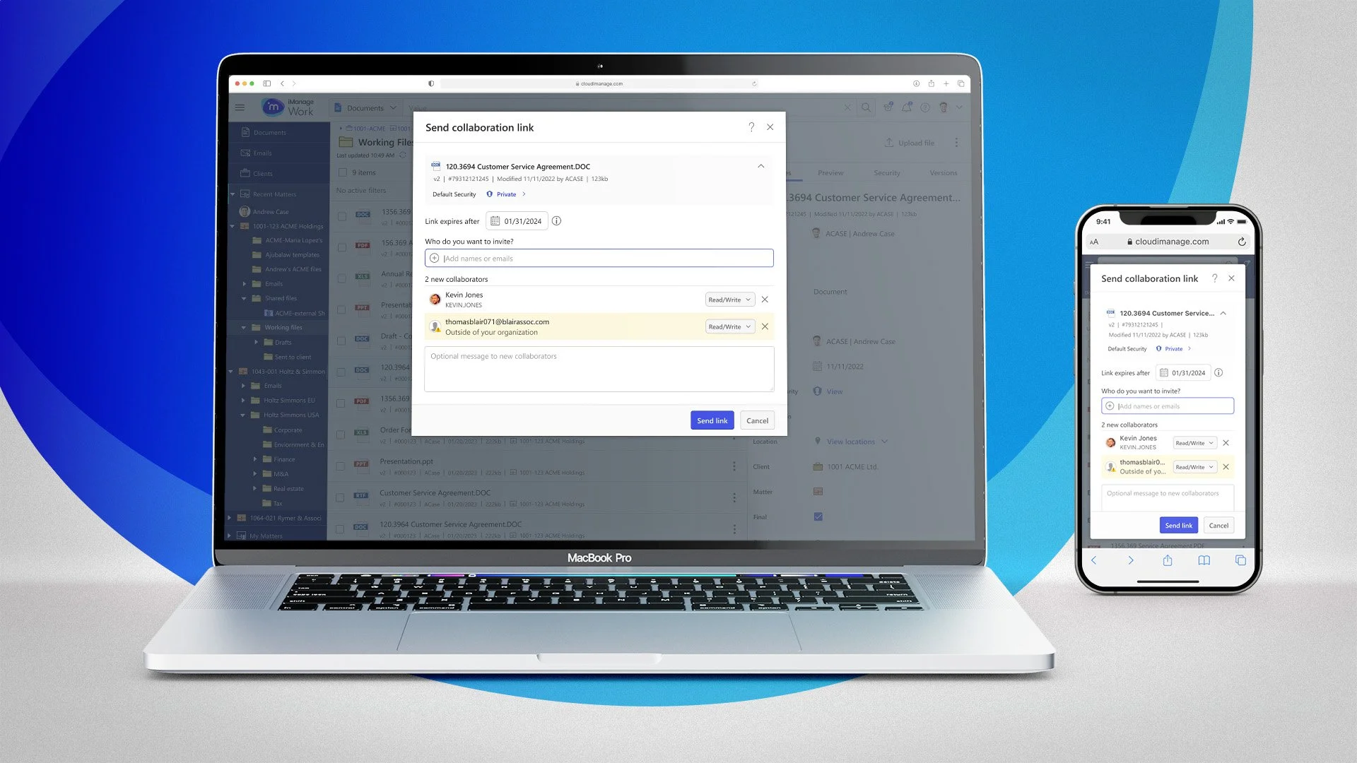The goal was to enable secure, trackable document sharing that keeps files within the iManage platform, while granting access to: